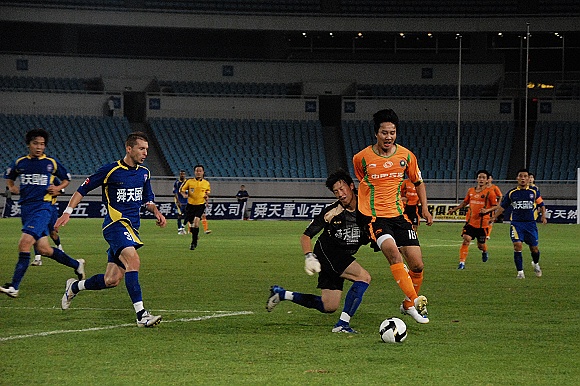 僅僅過了7分鐘,舜天國信隊卷土重來,譚斯在邊路奮力救出一個差點出界的球,帶球從邊路快速疾進,禁區前射了一個近角,4:1,舜天國信隊大比分領先。