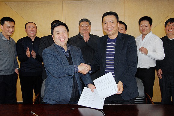 北京理工大學黨委副書記、副校長楊賓(左)與貴人鳥(中國)有限公司總裁林天福(右)分別代表雙方在協議上簽字并預祝雙方合作愉快。北京理工大學原黨委書記焦文俊、副校長李和章、足球隊總教練金志揚教授及雙方相關部門負責人參加了簽字儀式。