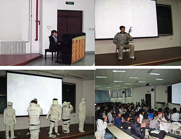 比賽由必答填空題、選擇題、搶答題、判斷題和簡答題組成,活動中選手們盡展聰明才智和個人魅力,競爭激烈。當然,歡樂的氣氛始終貫穿整個活動現(xiàn)場,比賽中還穿插有互動游戲“木乃伊”和精彩的鋼琴、二胡獨奏。
