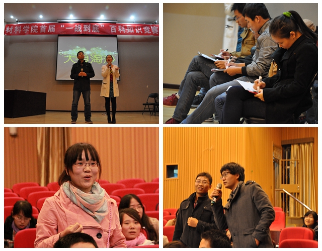 2013年11月3號(hào)18:00,材料學(xué)院首屆“一戰(zhàn)到底”百科知識(shí)競(jìng)賽在七號(hào)樓報(bào)告廳拉開(kāi)帷幕,此次活動(dòng)由材料學(xué)院研究生會(huì)主辦,材料學(xué)院黨委副書(shū)記副院長(zhǎng)張艦月、材料學(xué)院團(tuán)委書(shū)記劉艷、團(tuán)委副書(shū)記張博文、兼職輔導(dǎo)員常云鵬出席活動(dòng)。