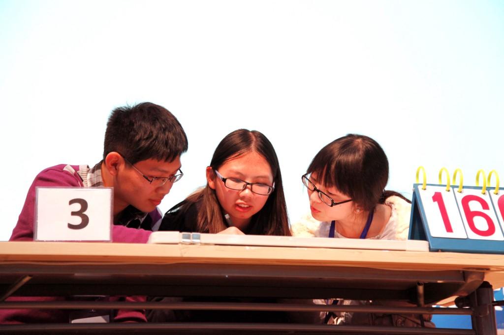 第三輪比賽為“爭分奪秒”搶答環節,各大團隊都蓄勢待發,積極搶答,因此出現了多次超前搶答的情況。我校選手也不甘示弱,十分敏捷,獲得了三次搶答機會,由于搶答第二題時我校選手在準備過程中出現了小失誤,導致答案記憶錯誤,因而失去這一題的得分。雖然出現了小小的失誤,選手們也絲毫不氣餒,他們互相打氣,再接再厲,沒有讓這一失誤影響之后的比賽。