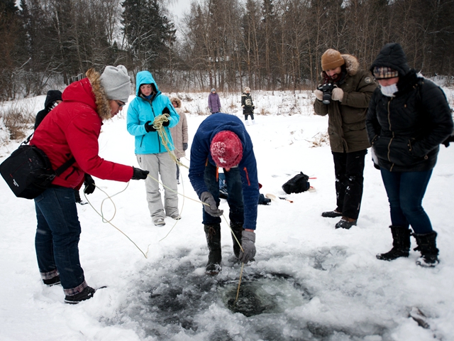 隨后,科考團各小組結合課題實驗設計,分別在多個地點采集水樣、土壤樣本、植物樣本等,并在現場進行了簡單的測試,記錄相關實驗數據。特別是-30℃的嚴寒及風雪天氣下,莫斯科河結冰厚度50余厘米,水樣采集難度非常大,北理工科考隊員與同在生態站科考的美國、俄羅斯、克羅地亞學生一起,共同順利完成了水樣及水體下相關物質的采集。