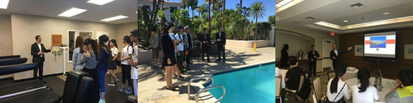7月16日至22日,暑期項目參訓團隊于洛杉磯成功開展了校友企業參觀活動,全體參訓學生對美國猶他州立大學校友Frank Yuan先生旗下Double Tree酒店(希爾頓酒店集團)進行了訪問參觀。參觀學習活動得到了酒店管理層的高度重視,酒店總經理Mike Powers先生、營銷總結Chen先生及客房服務總監Elena Fu小姐為同學們詳細講授了酒店運行中的實際情況,使同學們了解到經濟學知識在實際企業運營過程中的重要性。隨后酒店管理團隊帶領同學們參觀了酒店整體及重點區域。