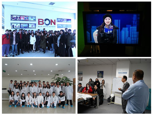 在內容豐富的課堂教學之余,同學們還分別參觀了藍海電視臺和西門子西伯樂斯公司。BON TV藍海電視是一個專注于中國內容全球傳播的非官方英文媒體,同學們先參觀了電視臺機房、錄音棚、演播廳等,并在參觀過程中過了一把主播癮。在西門子西伯樂斯,除參觀加工工廠、全面了解“生產-運營-銷售”這一完整的運營過程外,公司負責人還為同學們詳細講述了公司的發展理念、就業實習政策等,并與大家廣泛交流、積極互動、答疑解惑,使同學們獲益良多。