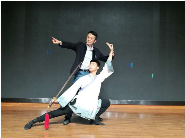 金浩教授的講座以距今三千年歷史的古老兵器劍為載體,從古老的劍器講到今天古典舞蹈道具,從技術層面、傳統文化層面和舞蹈審美意蘊層面,給同學們帶來了集理論實踐于一體的劍舞盛宴。讓同學們體悟劍是中國韻味的文化利器與禮器,劍文化的古典與再現古典,以及古典劍舞身韻中“劍由身帶,意由劍顯”的古典精神理念。通過現場劍舞展示和視頻劍舞片段欣賞,讓同學們在身法和劍法不斷磨合相融中,加深對這八個字的理解。