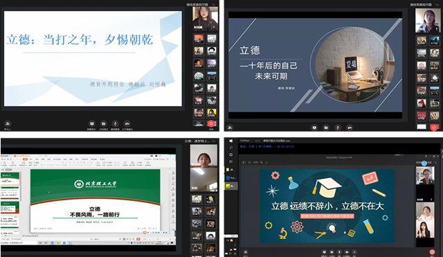 “受到北理一絲不茍、踏實(shí)認(rèn)真、低調(diào)從容品質(zhì)潛移默化的影響,我在追求卓越的路上不斷前行”德翊書生丁戈在德翊班特色環(huán)節(jié)“我·北理初印象”中抒發(fā)了對(duì)我校的真情實(shí)感。德祎班“班徽設(shè)計(jì)”特色活動(dòng),以“一”與班名“祎”諧音寄托了全體德祎人的美好希冀;德清班詩(shī)朗誦《萬(wàn)眾一心抗疫情》,慷慨激昂,擲地有聲,盡顯當(dāng)代大學(xué)生對(duì)抗疫工作者的崇敬,以及對(duì)“戰(zhàn)疫”必勝的決心。每個(gè)班級(jí)通過(guò)自己的特色活動(dòng)展示了這段特殊時(shí)期班級(jí)的新時(shí)期書生風(fēng)貌、充實(shí)的學(xué)習(xí)生活、相互訴說(shuō)著思念。雖然無(wú)法面對(duì)面,依舊可以心連心。