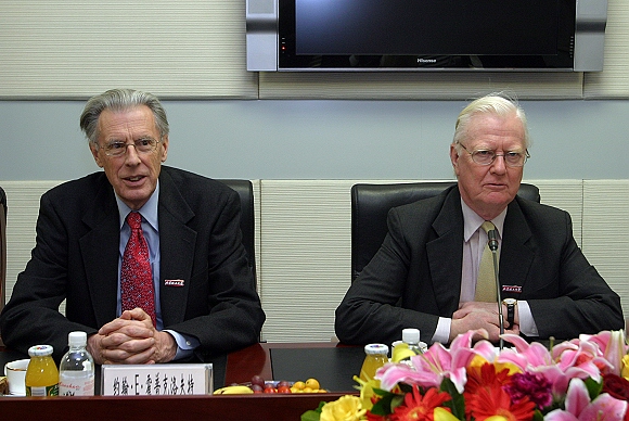1996年諾貝爾經(jīng)濟學獎獲得者詹姆斯·莫里斯爵士(Sir James Mirrlees)(右) 和1986年圖靈獎獲得者約翰·E·霍普克洛夫特教授(John E. Hopcroft)被聘為北京理工大學名譽教授。