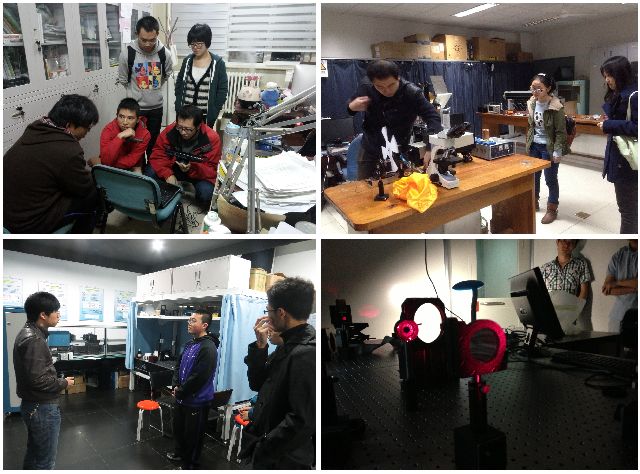 在激光雷達(dá)實驗室,陳和帶領(lǐng)所聯(lián)系同學(xué)們參觀并與同學(xué)們討論了“導(dǎo)盲小車”和kinect圖像采集功能。劉明老師帶領(lǐng)所聯(lián)系同學(xué)們參觀了現(xiàn)代光學(xué)實驗室,介紹了很多前沿的新科技和新成果,拓寬了專業(yè)視野。