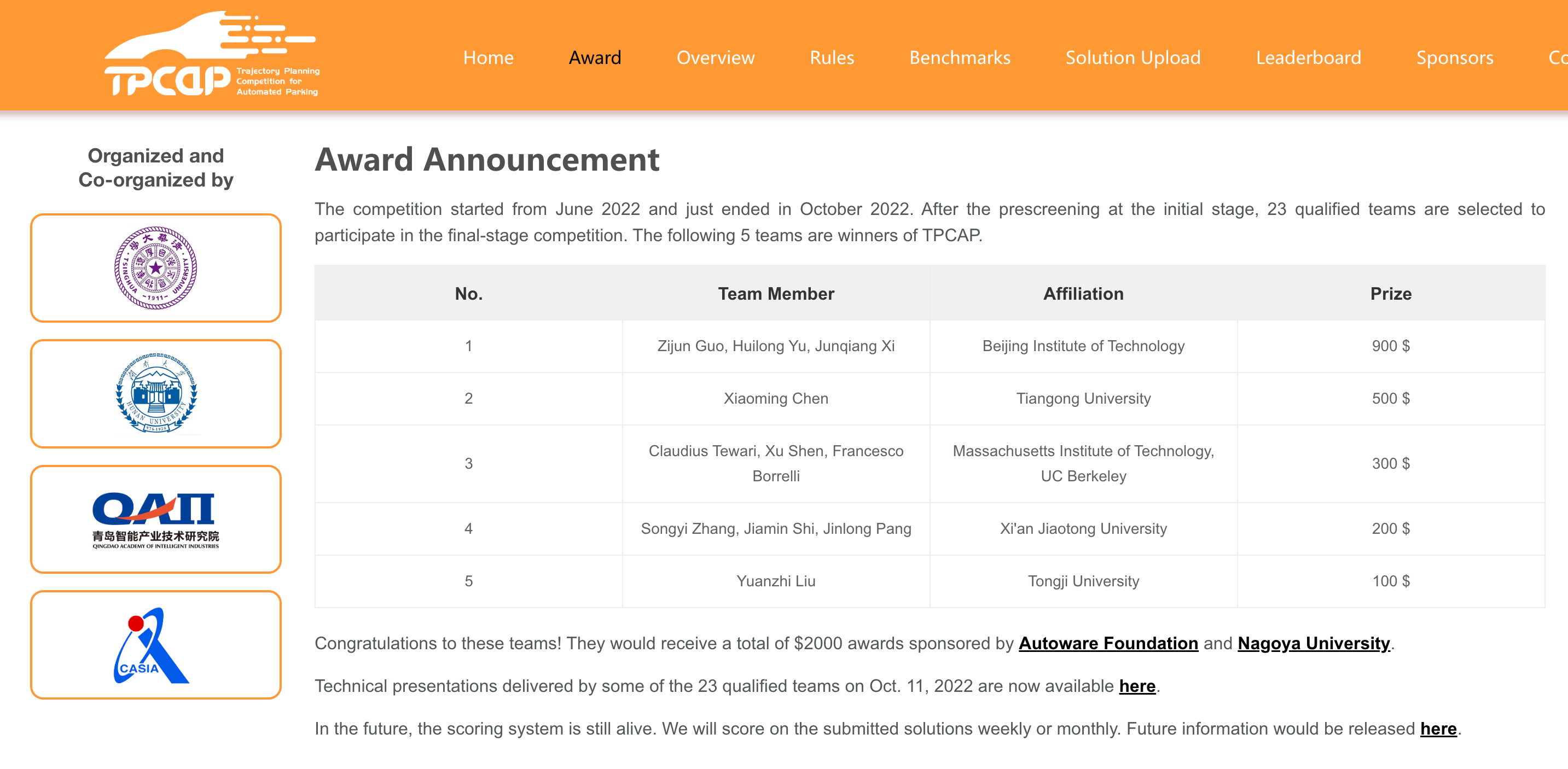 9月18日,第25屆IEEE智能交通系統國際會議(IEEE International Conference on Intelligent Transportation Systems,簡稱IEEE ITSC 2022)在北京開幕。大會設立自主泊車軌跡規劃全球挑戰賽(Trajectory Planning Competition for Automated Parking,TPCAP)。北京理工大學機械與車輛學院汽車研究所郭子雋博士、于會龍教授、席軍強教授團隊獲得挑戰賽第一名。