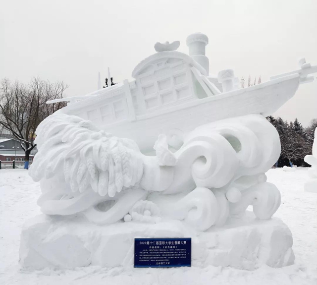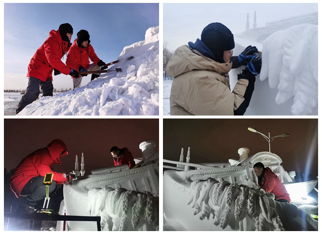 2020年1月4日,雪雕隊前往哈爾濱開啟比賽。三天的比賽時間里,雪雕隊冒著零下20攝氏度的低溫,在臨時黨支部帶領下,經受住了惡劣自然條件和長時間大強度的戶外作業的考驗,齊心協力、拼搏奮斗,把紅船精神注入作品,讓冰雪煥發出火熱的生命力。